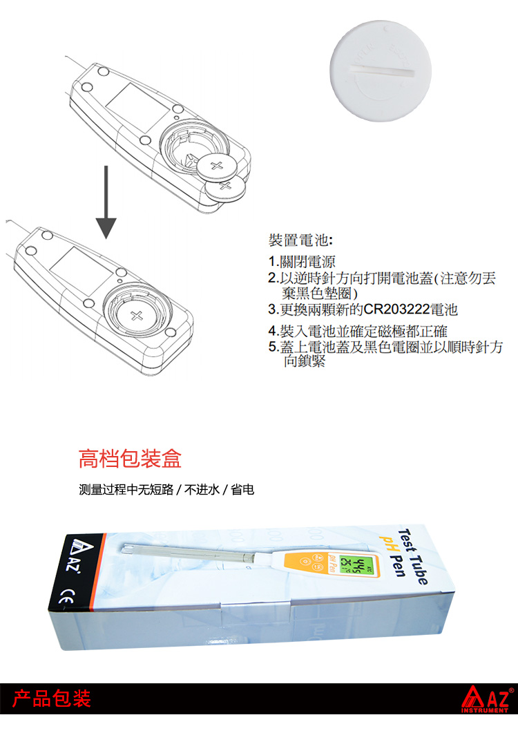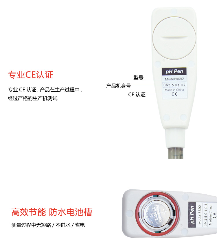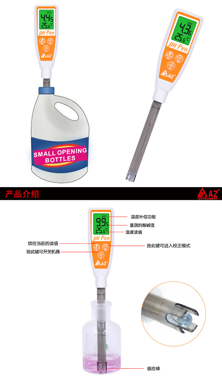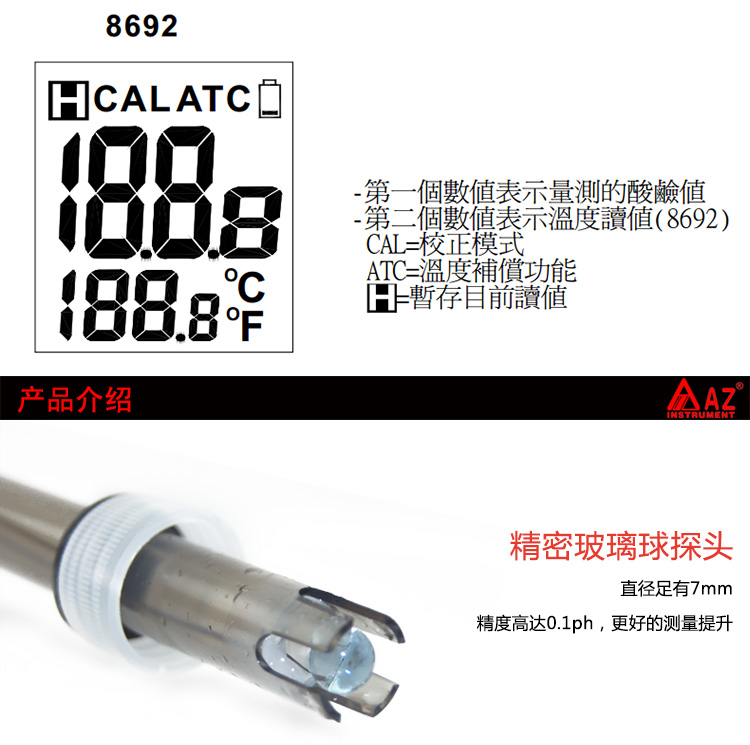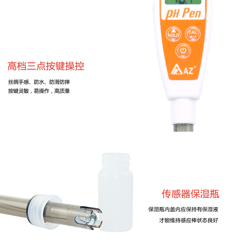 經(jīng)濟筆型酸堿計,雙屏幕可同時顯示溫度與酸堿值(8681/8682);溫度補償功能,三點自動校正,簡易操作。具有IP67級數(shù)防水功能;自動補償/辯識溶液溫度避免校正錯誤;資料保留功能,省電關(guān)機可解除。